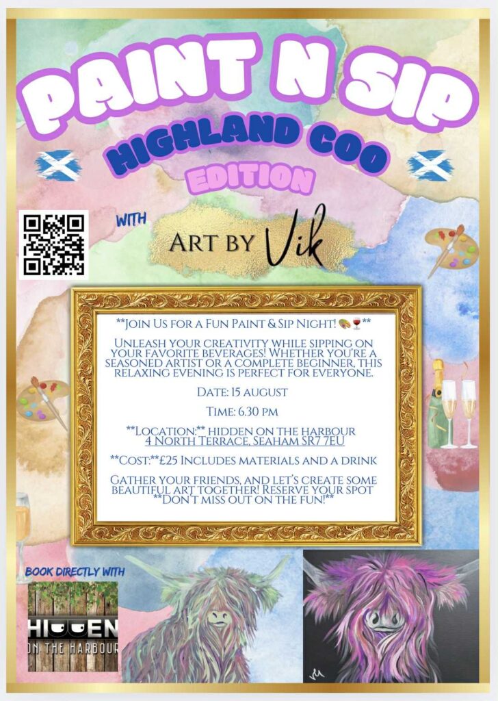 New Paint and Sip added for August 15th at Hidden on the Harbour This is our Hettie Coo theme Book direct with Hidden 07831824706 Seaham Come along and join me and paint Hettie Coo, this is a great night to enjoy with friends. Get together for lots of fun, giggles and creativity making memories