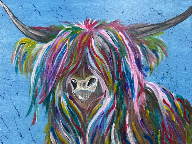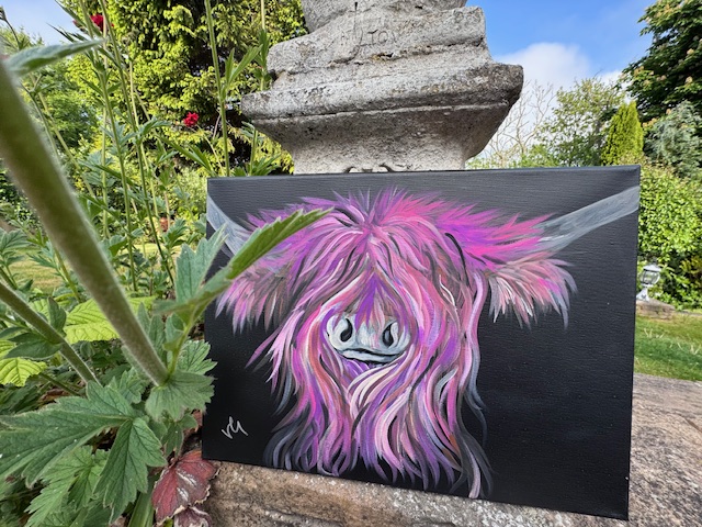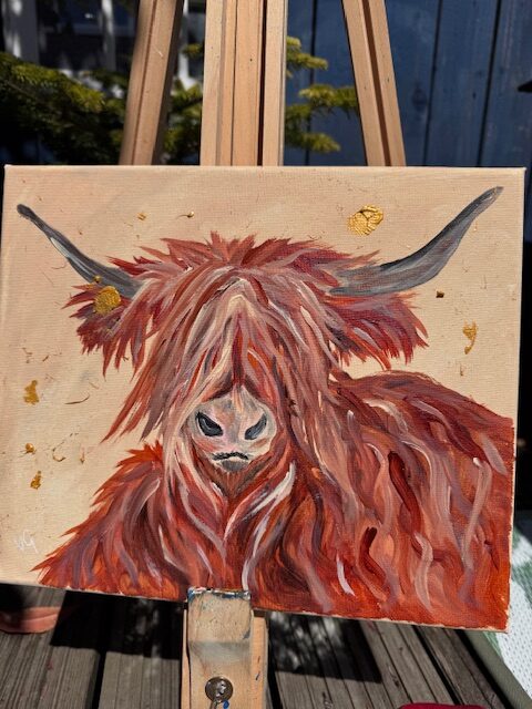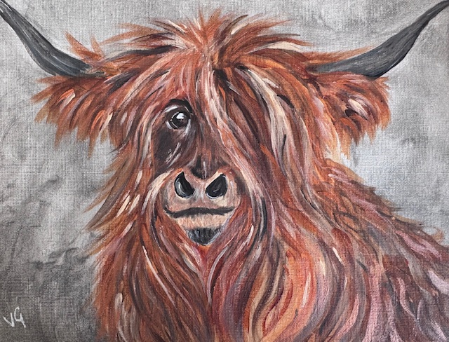 This is Dougal the Highland Cow, hes lots of lovely rich colours with a grey moody background. He measures 12×10 inches and is painted on canvas